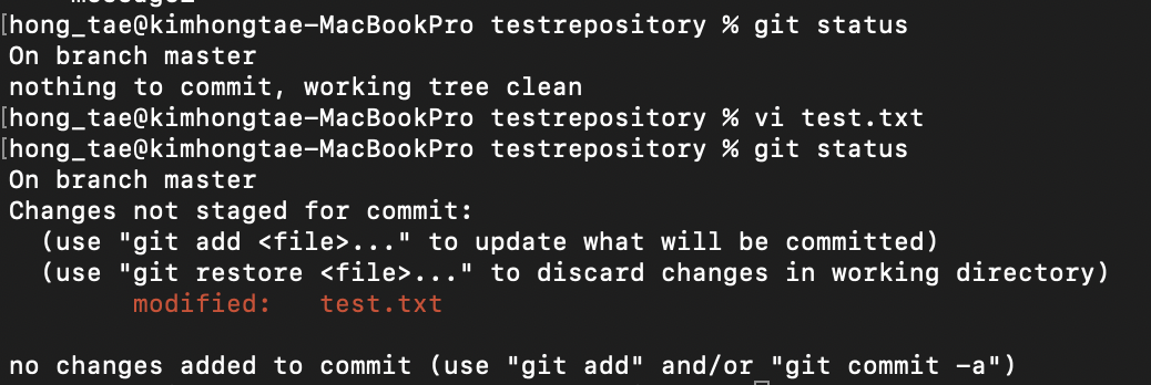 commit 후 working directory의 파일이 변경되었을 때 '$ git status'로 git 상태를 보면 다음과 같다